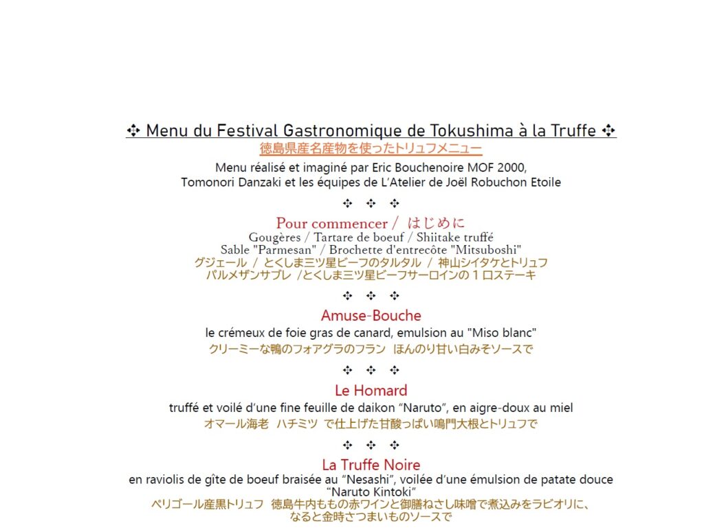 また、「食材提案会」に合わせて「Menu du Festival Gastronomique de Tokushima à la Truffe(徳島県名産物を使ったトリュフメニューフェア)」を開催します。